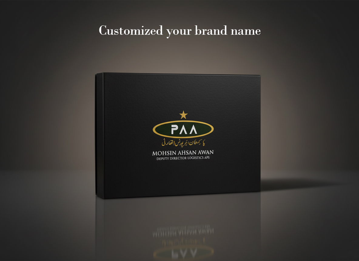 This premium PAA Branded Gift Box is designed to deliver an elegant and professional presentation. Featuring a sleek matte-black finish with a refined gold and green logo, the box exudes sophistication and prestige. Personalized details on the front add a custom touch, making it ideal for corporate gifting, recognition awards, and high-level executive presentations.