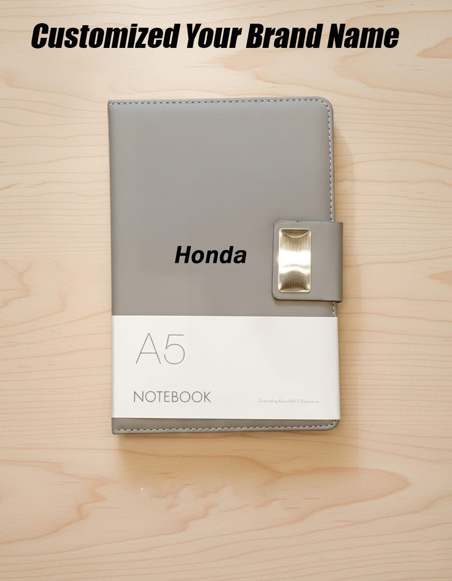 Upgrade your professional stationery with this premium A5 Customized Notebook, designed with a sleek grey cover and secure metal clasp. Perfect for corporate branding, employee gifts, or promotional events, this notebook allows you to personalize your logo or brand name on the cover. Its elegant look and durable build make it ideal for daily note-taking, planning, and business use.