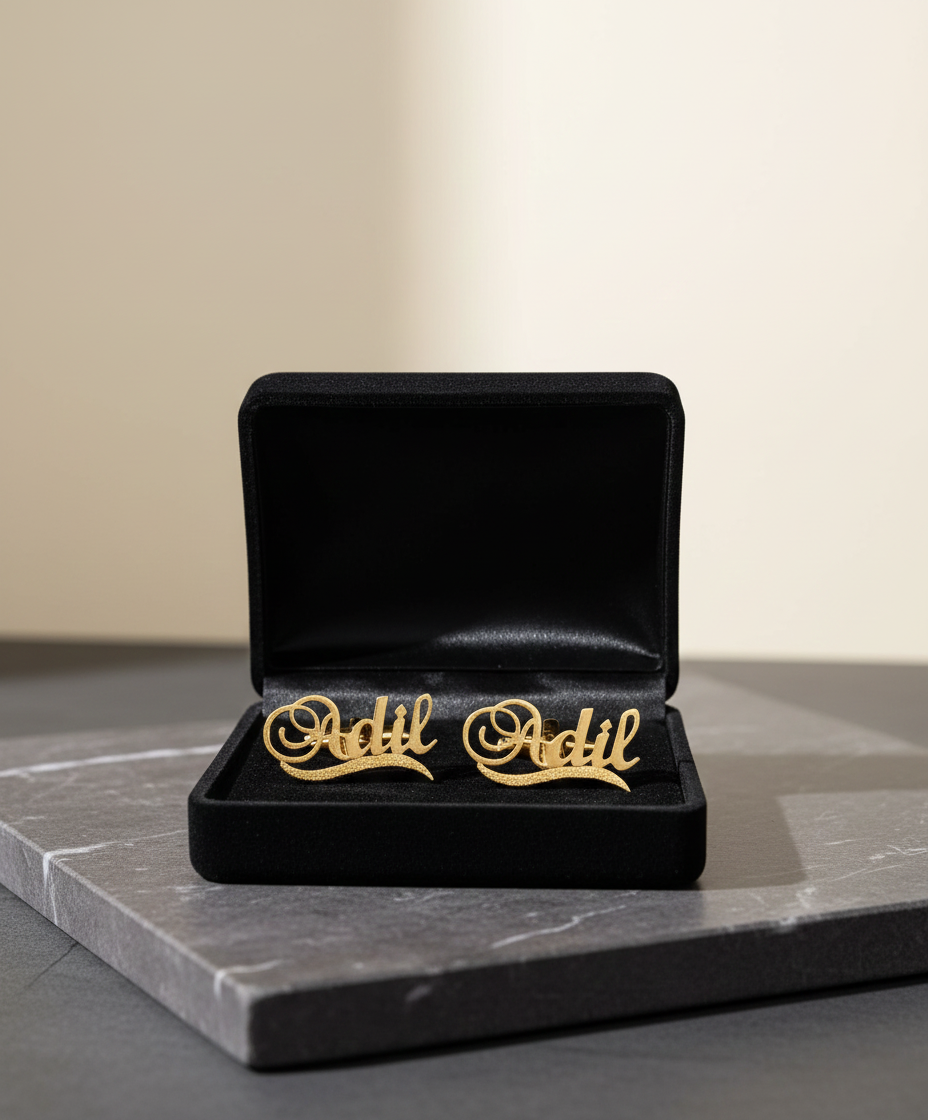 Elegant custom name cufflinks crafted in a polished gold finish, designed to add a personalized touch to any formal outfit. These stylish “Adil” cufflinks come in a premium black velvet box, making them a perfect gift for special occasions.