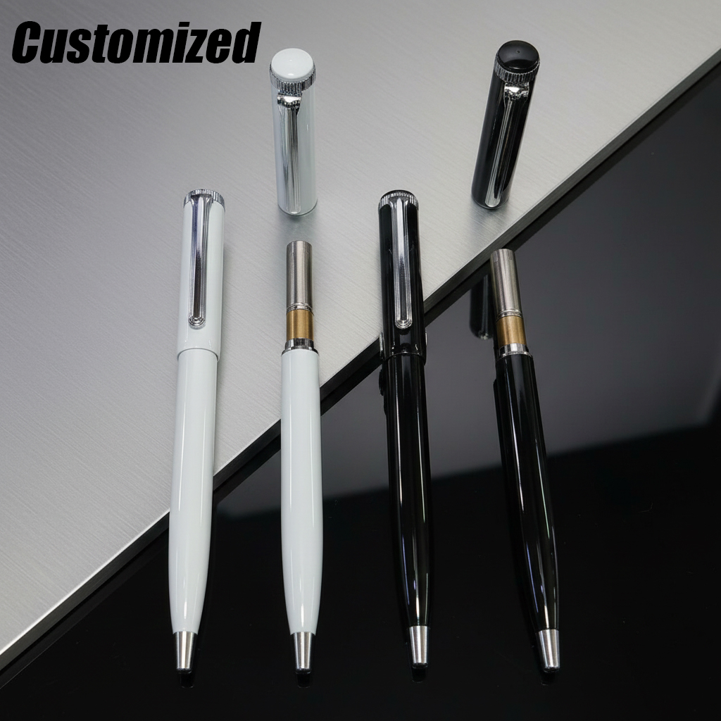 Premium customizable ballpoint pens featuring a sleek metal finish and removable caps. Available in glossy white and black bodies with polished chrome details. Ideal for corporate branding, giveaways, or professional everyday use.