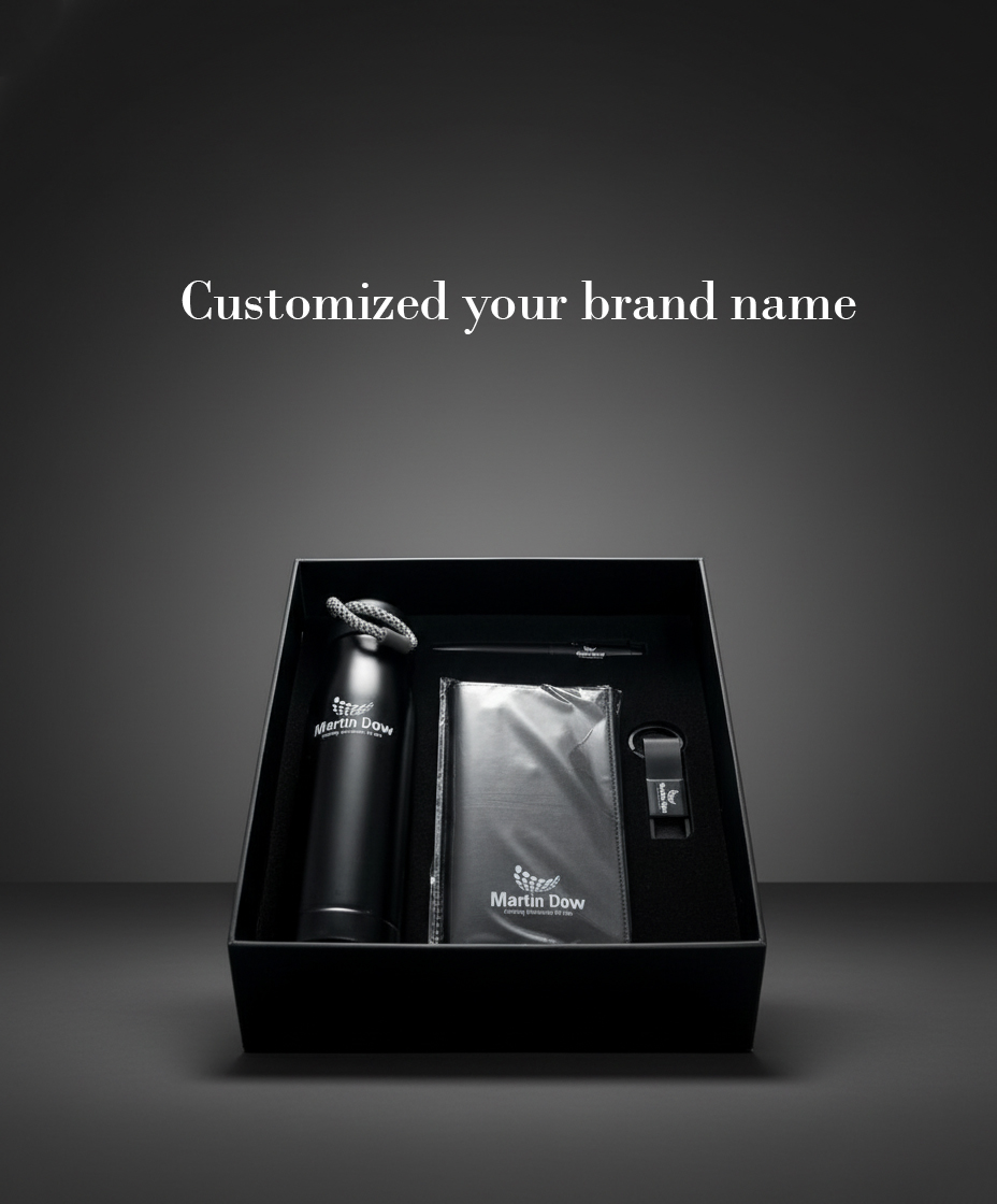 This premium corporate gift set is designed to make a lasting impression. Packaged in a sleek black box, it includes a high-quality water bottle, notebook, pen, and USB drive — all branded with the Martin Dow logo. Perfect for corporate events, employee onboarding, client gifting, and professional giveaways, this set combines practicality with an elegant, modern presentation.