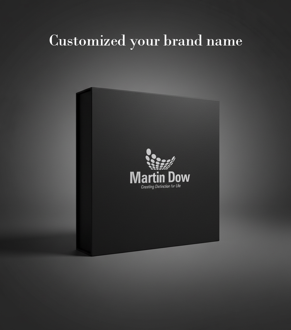 This premium Martin Dow branded gift box is designed with a sleek, minimalist aesthetic, showcasing the company’s iconic logo and tagline “Creating Distinction for Life.”