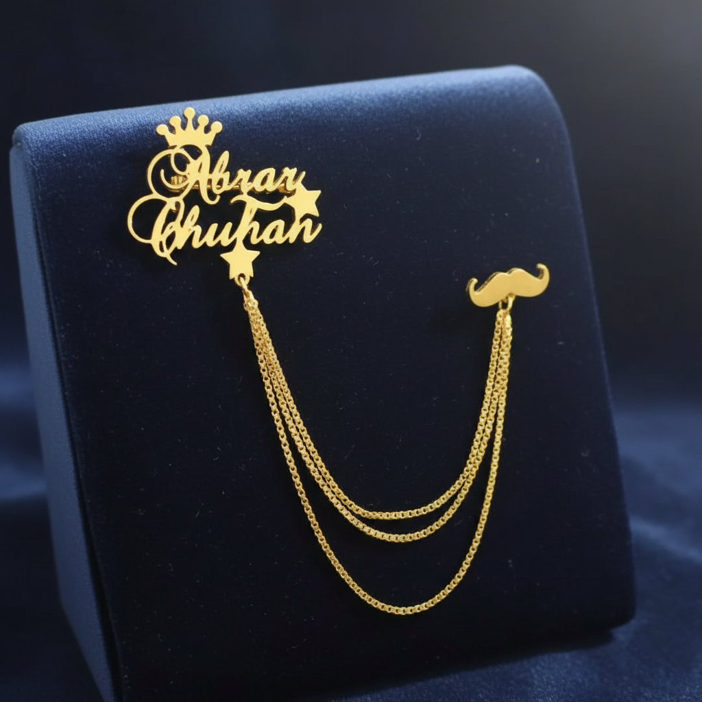This elegant customized name brooch features a premium gold-plated finish with a stylish dual-pin design. One side displays a personalized name cutout adorned with a crown and stars, while the other side features a classic mustache emblem. Three delicate gold chains connect both pins, creating a fashionable accessory perfect for weddings or events.