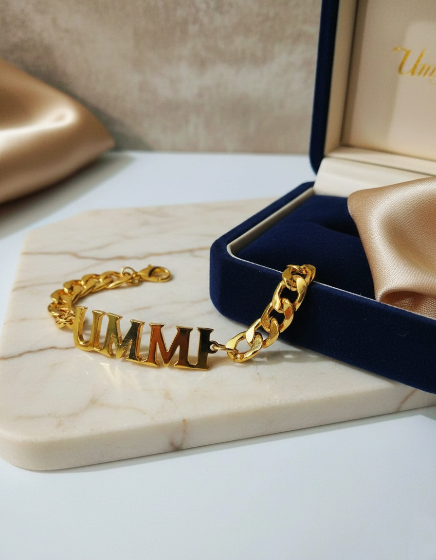A beautifully crafted gold-plated bracelet featuring the word ?UMMI? ? a heartfelt tribute to mothers.