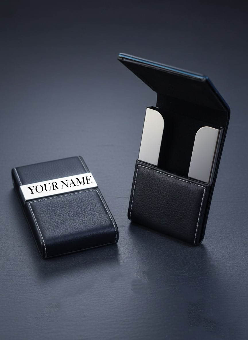 Upgrade your professional style with this premium Personalized Leather Card Holder. Crafted with high-quality faux leather and a sleek metal accent plate, it securely stores your business cards while adding a touch of sophistication. The custom name engraving makes it a perfect gift for executives, entrepreneurs, and professionals.