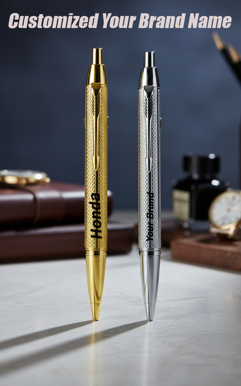Elevate your professional image with our premium customizable metal pens. Crafted with a sleek, textured finish in gold and silver options, these pens offer a luxurious feel while showcasing your brand with precision-engraved customization. Perfect for corporate gifting, events, promotions, or executive use.
