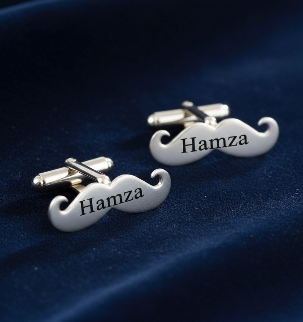 Add a touch of personality to your formal look with these stylish Mustache-Shaped Personalized Cufflinks. Crafted with a sleek metallic finish, each cufflink is customized with the name “Hamza”, making it a thoughtful gift for birthdays, weddings, or special occasions. Perfect for anyone who loves unique accessories with a fun twist
